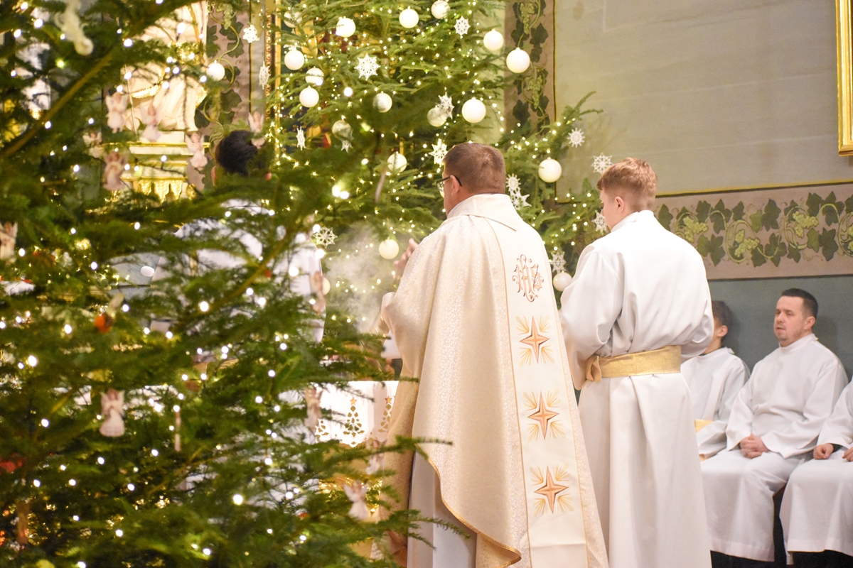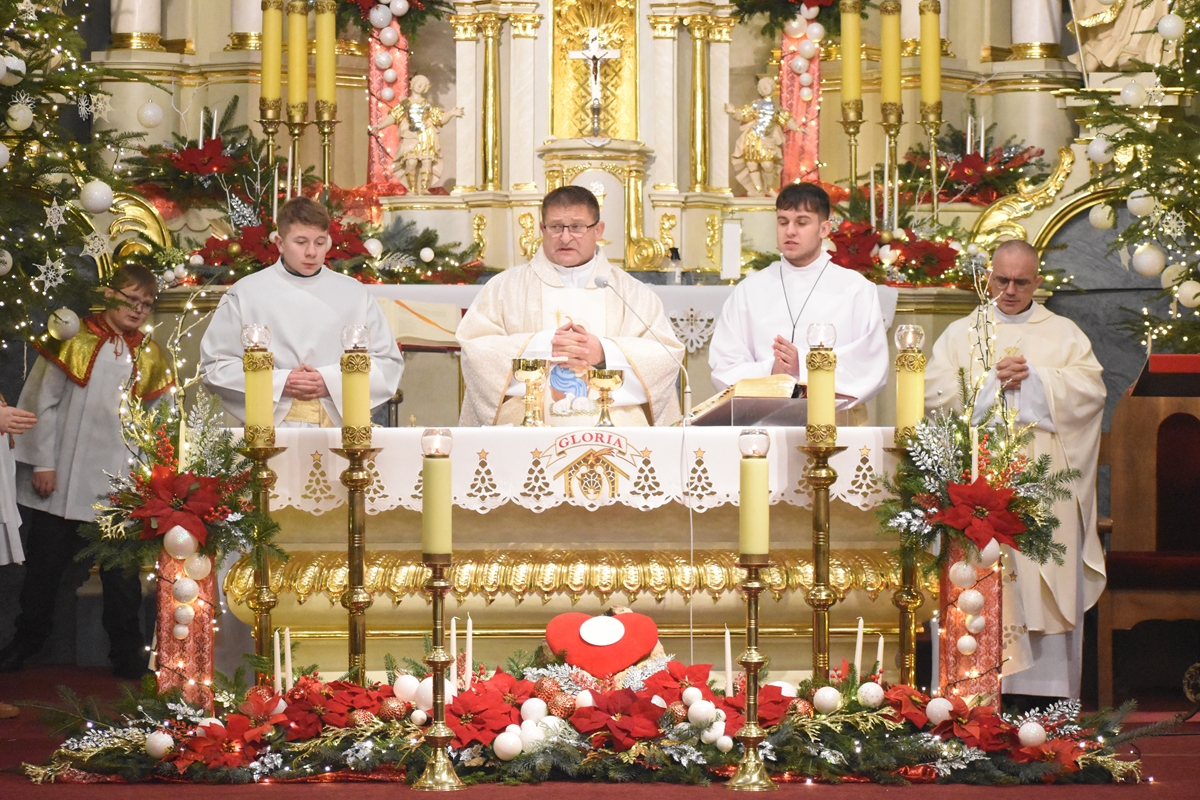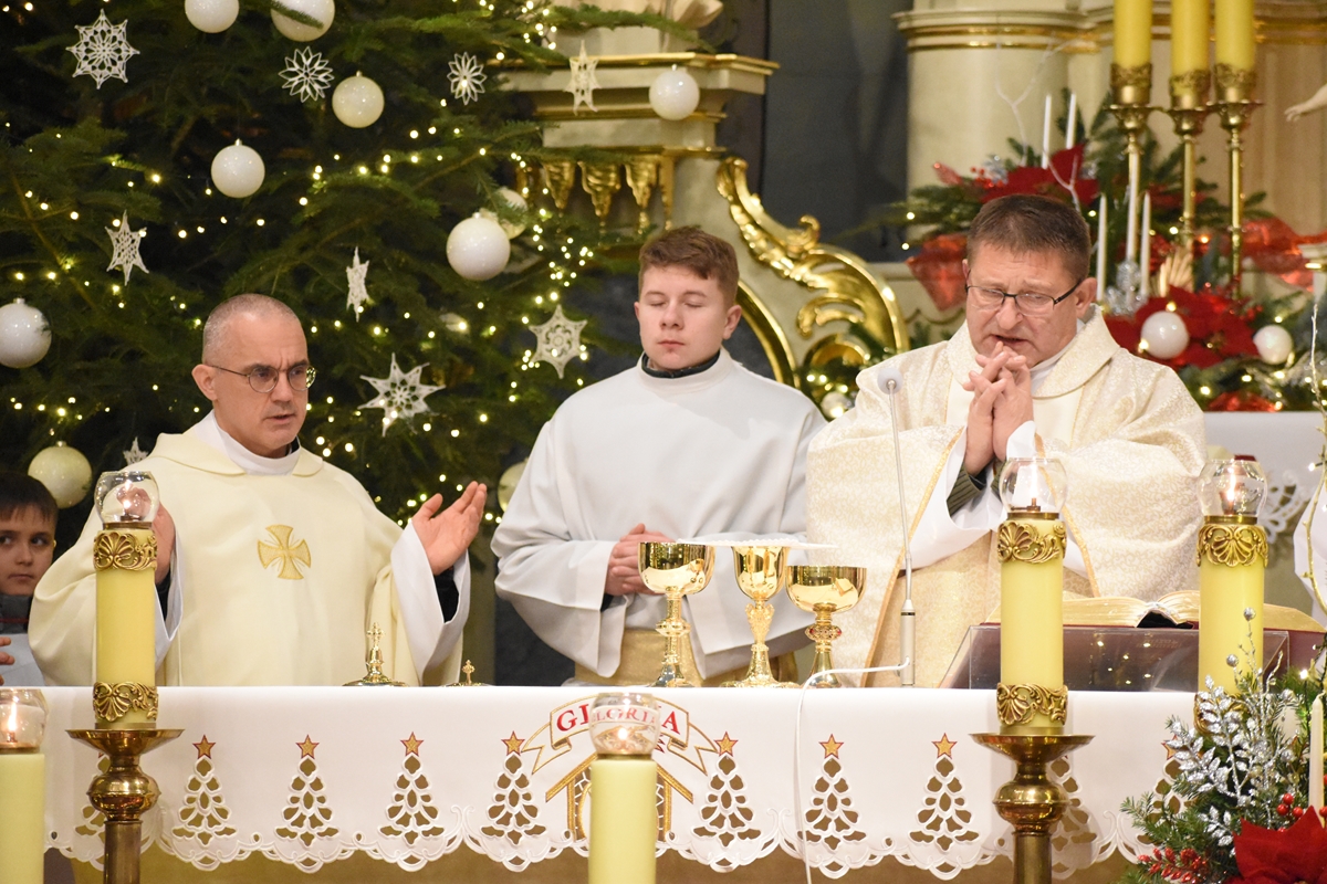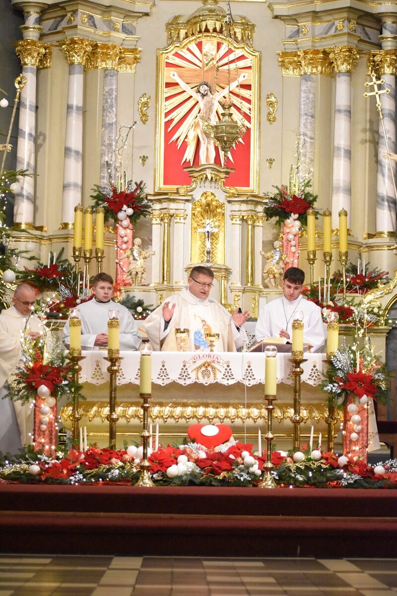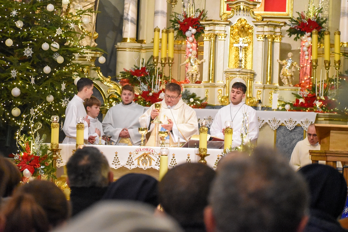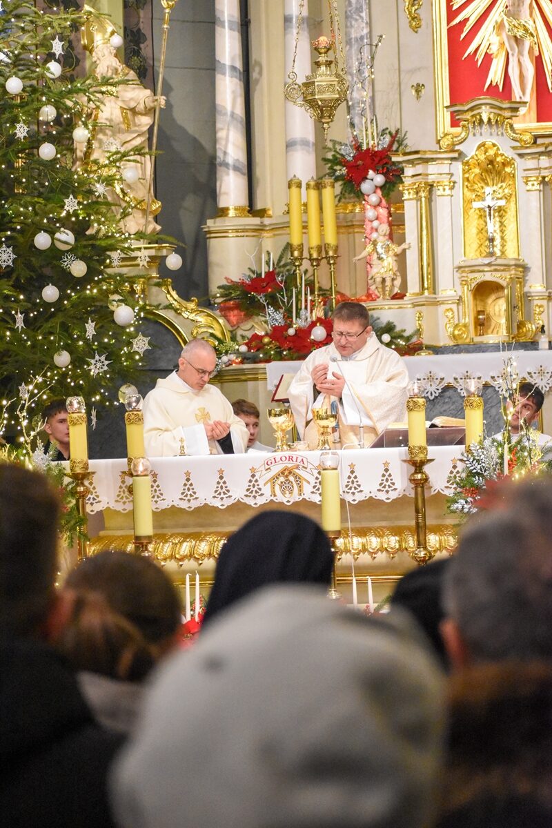 Liturgii przewodniczył ks. Tadeusz Mieleszko, natomiast posługę w asyście pełnił ks. Krzysztof Sławniak. To on wygłosił homilię, w której przybliżył głęboki sens Bożego Narodzenia, zachęcając wiernych do otwartości serc, budowania pokoju oraz pielęgnowania wzajemnej miłości w codziennym życiu.