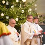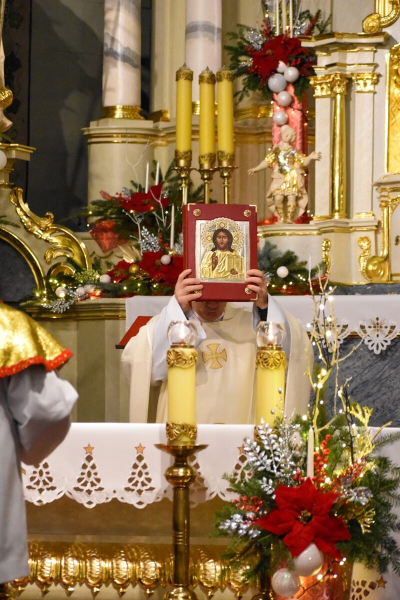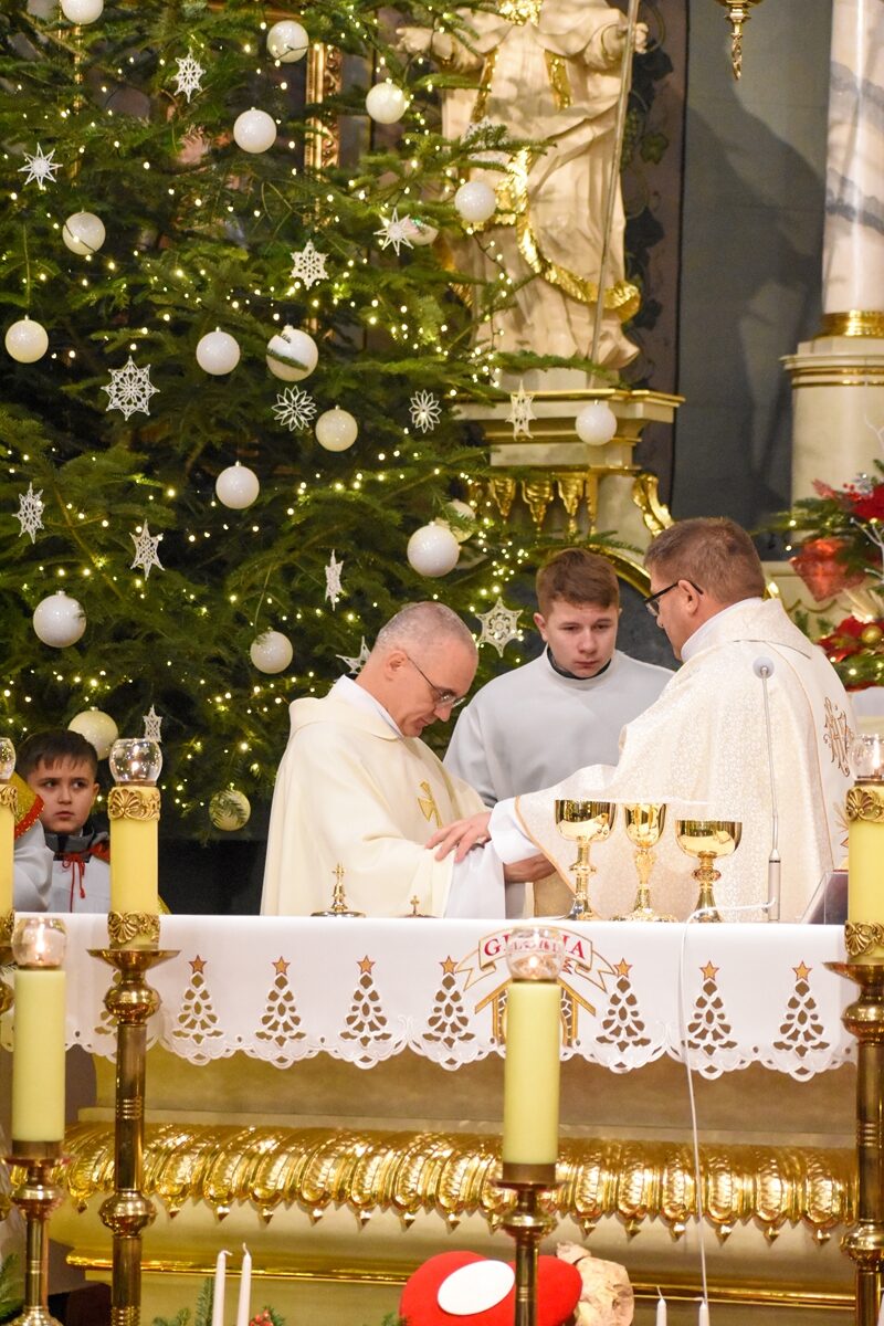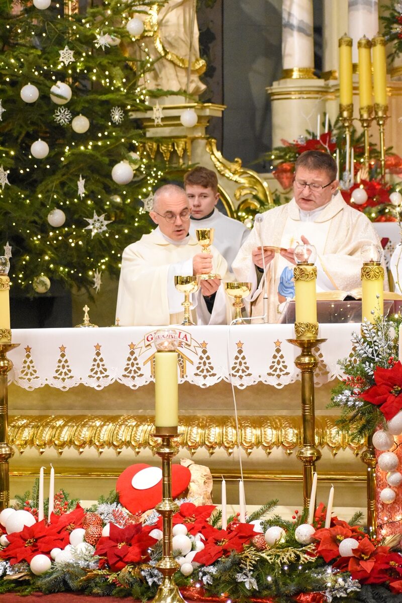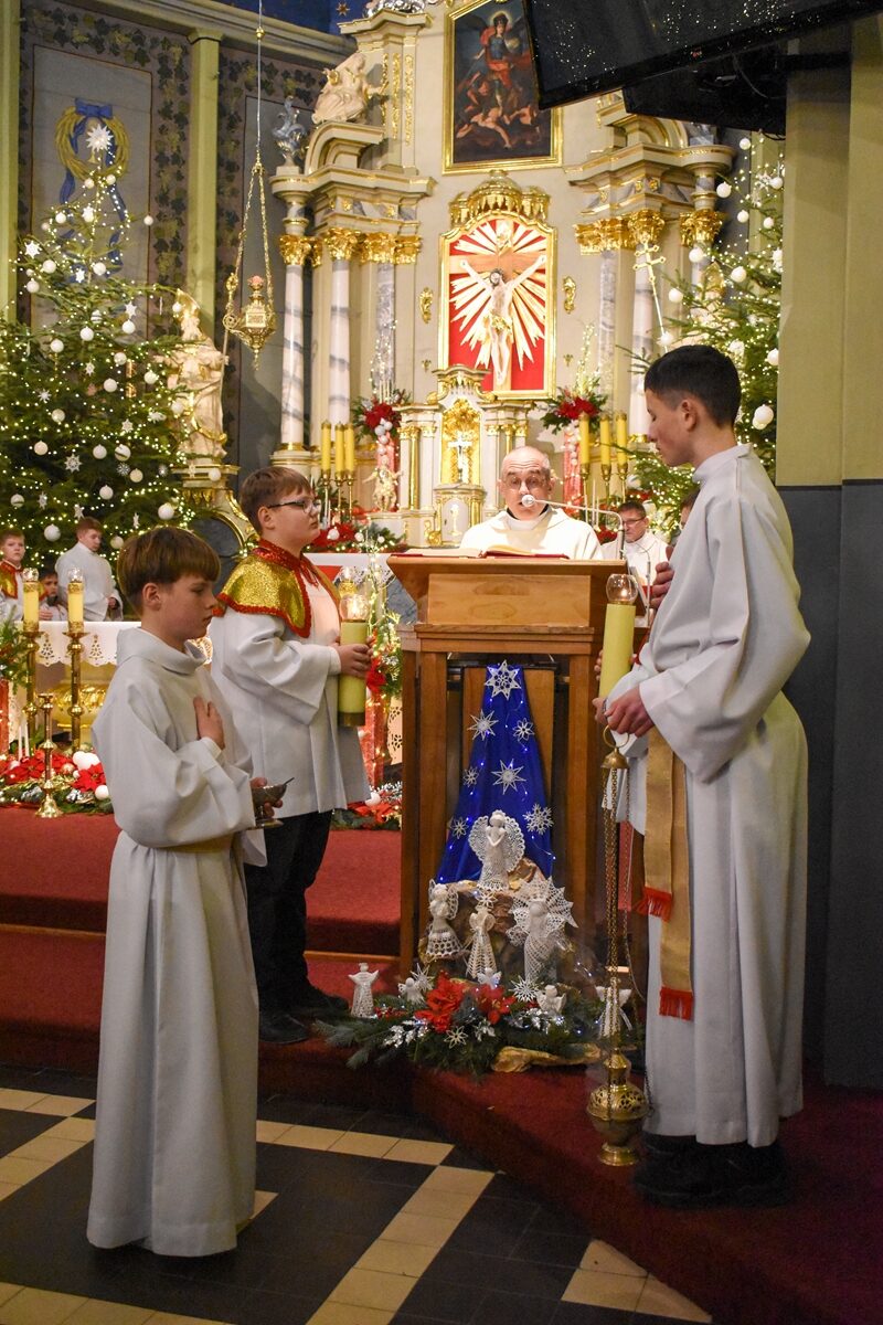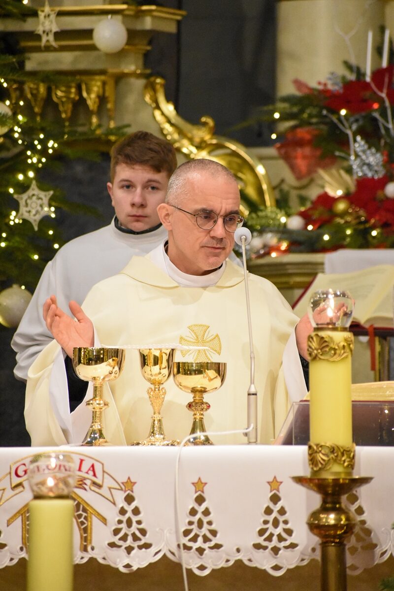 Liturgii przewodniczył ks. Tadeusz Mieleszko, natomiast posługę w asyście pełnił ks. Krzysztof Sławniak. To on wygłosił homilię, w której przybliżył głęboki sens Bożego Narodzenia, zachęcając wiernych do otwartości serc, budowania pokoju oraz pielęgnowania wzajemnej miłości w codziennym życiu.